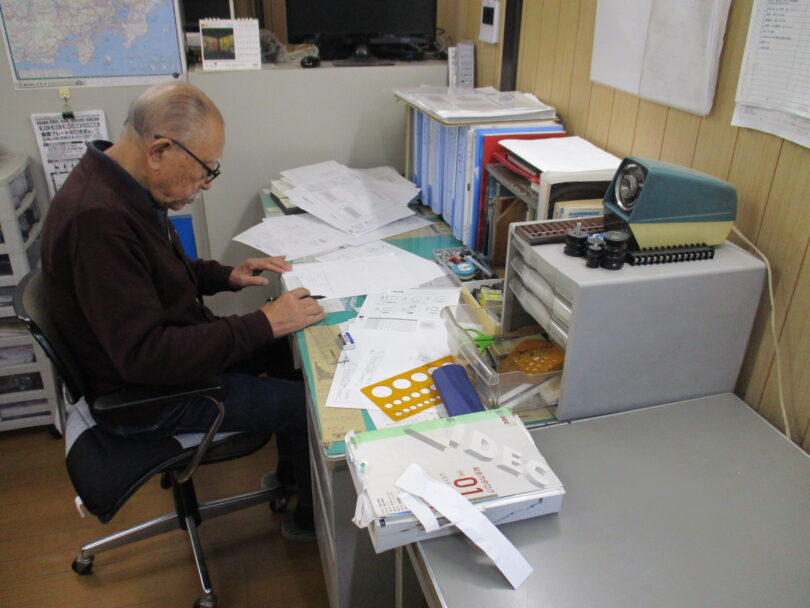 弊社では、91歳の会長が現役で設計に携わっております。とても元気で、考える意欲が衰えておりません。今でも、利用者の方、組立をする方々の目線で設計を楽しんでおります。
