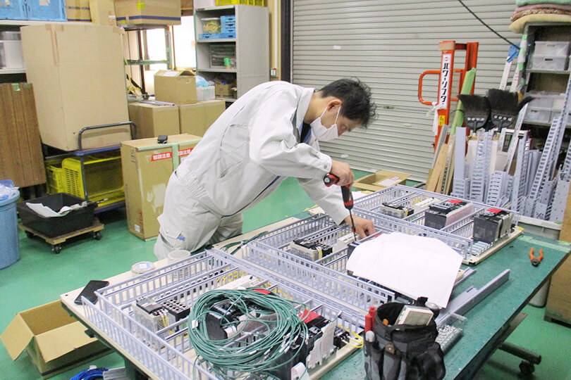 制御盤制作は、図面に沿って組み立て・配線を行います。